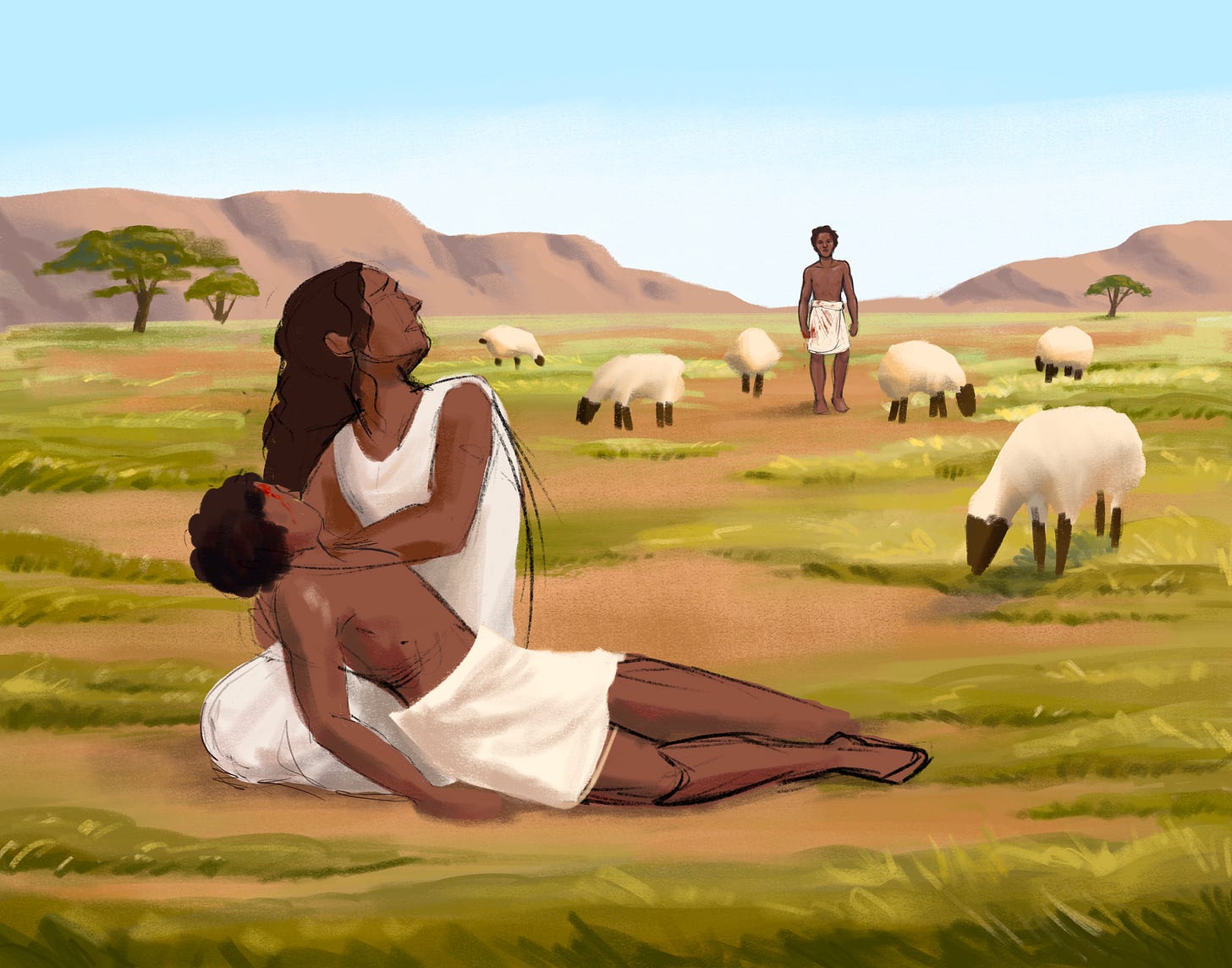 And kneeling on bare ground, clutching Abel’s bloody robe